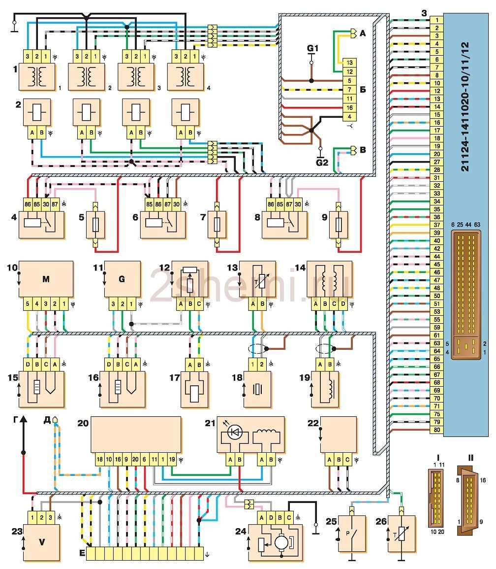 Схема соединений системы управления двигателем ВАЗ-21124 с распределенным впрыском топлива под нормы токсичности Евро-3 (контроллер M7.9.7): 1 — катушки зажигания; 2 — форсунки; 3 — контроллер; 4 — главное реле; 5 — предохранитель, соединенный с главным реле; 6 — реле электровентилятора системы охлаждения; 7 — предохранитель, соединенный с реле электровентилятора системы охлаждения; 8 — реле электрического топливного насоса; 9 — предохранитель, соединенный с реле электрического топливного насоса; 10 — датчик массового расхода и температуры воздуха; 11 — датчик неровной дороги; 12 — датчик положения дроссельной заслонки; 13 — датчик температуры охлаждающей жидкости; 14 — регулятор холостого хода; 15 — управляющий датчик кислорода; 16 — диагностический датчик кислорода; 17 — электромагнитный клапан продувки адсорбера; 18 — датчик детонации; 19 — датчик положения коленчатого вала; 20 — блок управления иммобилайзера; 21 — индикатор состояния иммобилайзера; 22 — датчик фаз; 23 — датчик скорости автомобиля; 24 — модуль электрического топливного насоса с датчиком уровня топлива; 25 — датчик контрольной лампы давления масла; 26 — датчик указателя температуры охлаждающей жидкости; А — колодка, присоединяемая к жгуту проводов салонной группы АБС; Б — колодка диагностики; В — колодка, присоединяемая к жгуту проводов кондиционера; Г — к выводу «+» аккумуляторной батареи; Д — к колодке жгута проводов боковых дверей; Е — колодка, присоединяемая к жгуту проводов панели приборов; G1, G2 — точки заземления; I — порядок условной нумерации штекеров в колодке блока управления иммобилайзера; II — порядок условной нумерации контактов в колодке диагностики.