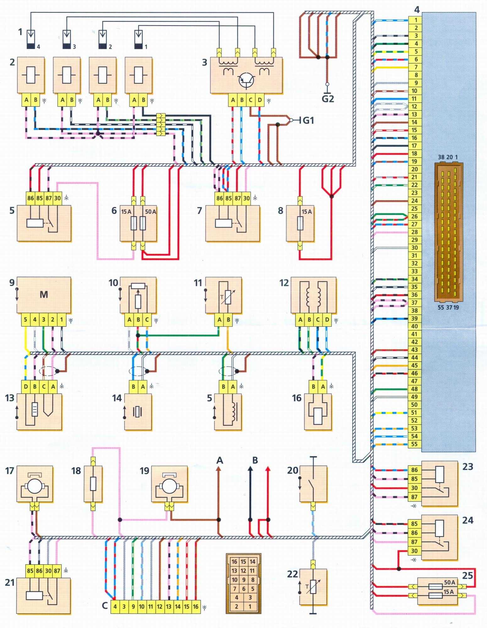 К1- реле импортное пяти контактное 40А 15,30,50 — клеммы замка зажигания Реле подключается на провода, выходящие из замка зажигания. После включения зажигания через секунд, подождать пока отработает бензонасос.