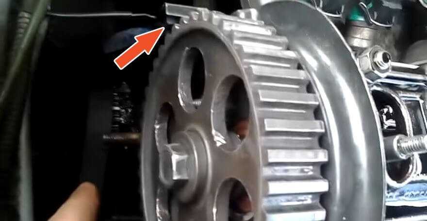 Проверяем совпадение метки на зубчатом шкиве распредвала с установочным усиком на задней крышке привода ГРМ. Ключом «на 17» отвинчиваем шкив.