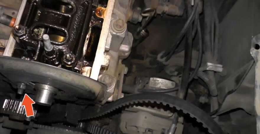 - С помощью дополнительного инструмента необходимо зафиксировать зубчатый шкив, чтобы он не мог изменить своего положения, после устраняется элемент крепежа и снимается вместе с соединительной шайбой.