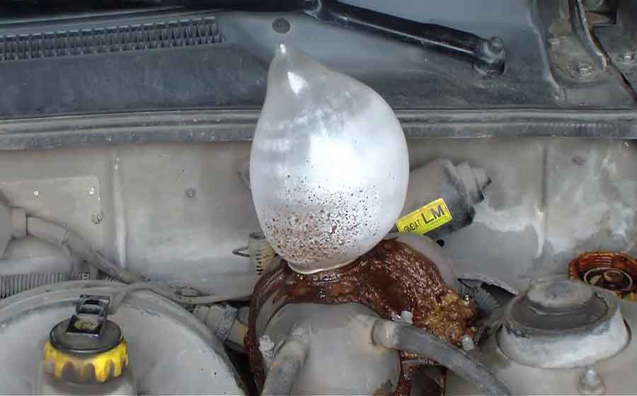 Наденьте резиновую перчатку, пакет (необходимо зафиксировать в основании), презерватив или воздушный шар на расширительный бачок, после чего запустите мотор и оставьте его на три-пять минут. Желательно увеличить обороты до трех-пяти тысяч. Чем серьезнее повреждение, тем быстрей изделие наполняется газами.