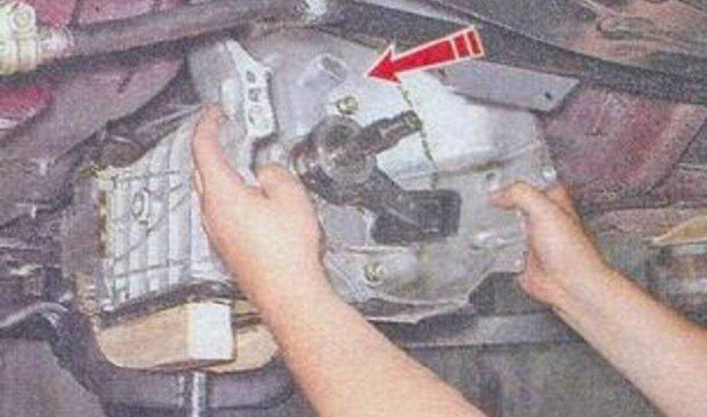 - Далее, возьмите ломик или монтировку и отодвиньте силовой агрегат КПП в сторону, противоположную мотору. Здесь вам понадобится помощь еще одного человека, так как агрегат необходимо двигать очень аккуратно, это может вызвать некоторые затруднения. Делайте это до тех пор, пока рычаг переключения скоростей не будет находиться возле заднего края отверстия в днище транспортного средства.