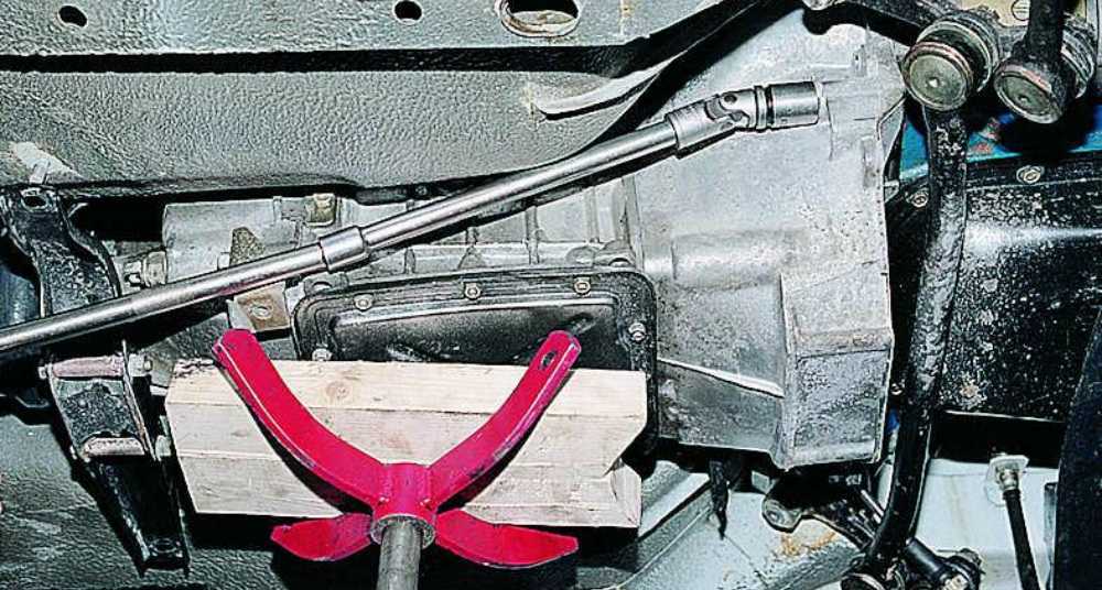 - В результате должно выйти так, что трансмиссионный узел вашего автомобиля ВАЗ 2107 будет находиться на приемной тубе. Здесь вам понадобится домкрат, который будет выполнять роль опоры. Его нужно подставить под коробку передач, чтобы она не соскользнула и не провисла на проводах, тем самым обезопасив агрегат от повреждений.