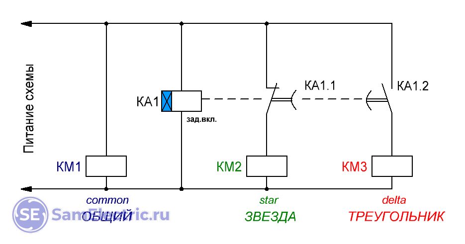 Да, ещё замечание. Иногда включение питания общего контактора КМ1 реализуют не напрямую, а через НО контакт “Звезды” КМ2, затем КМ1 становится на самоподхват через свой НО контакт. Это необходимо для дополнительной проверки работоспособности реле времени КА1.
