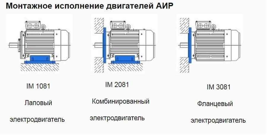 - Вид монтажа – всего существует три способа для электродвигателя АИР: IM1081 – на станину (горизонтально), IM2081 и на станину, и на фланец (и горизонтально, и вертикально), IM3081 только на фланец (вертикально). Пример вариантов основного исполнения приведен на рисунке ниже: