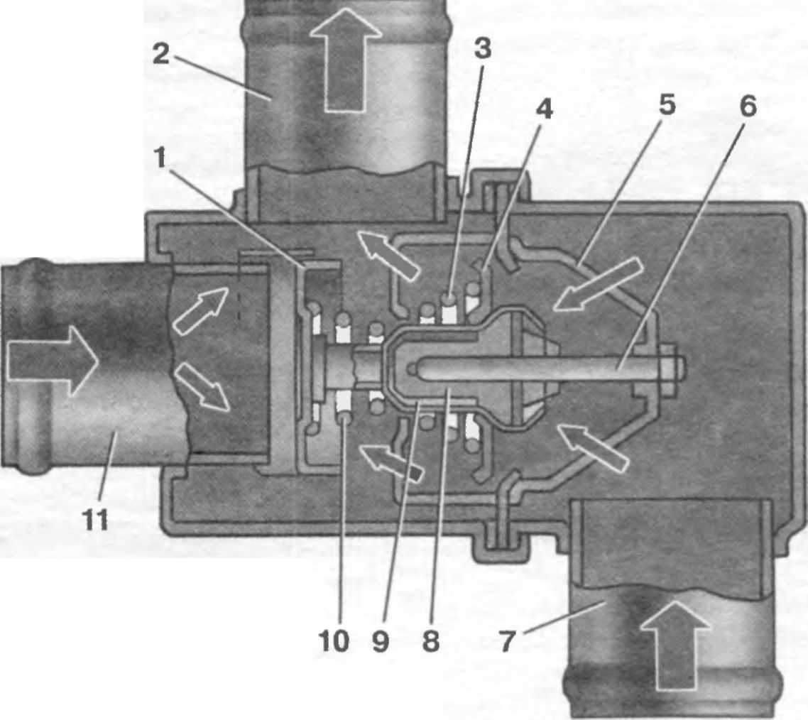 2 – выходной патрубок (к насосу); 3 – пружина основного клапана; 4 – основной клапан; 5 – держатель поршня; 6 – поршень; 7 – входной патрубок (от радиатора), 8 – резиновая вставка; 9 – твердый термочувствительный наполнитель; 10 – пружина перепускного клапана; 11 – входной патрубок (от двигателя)