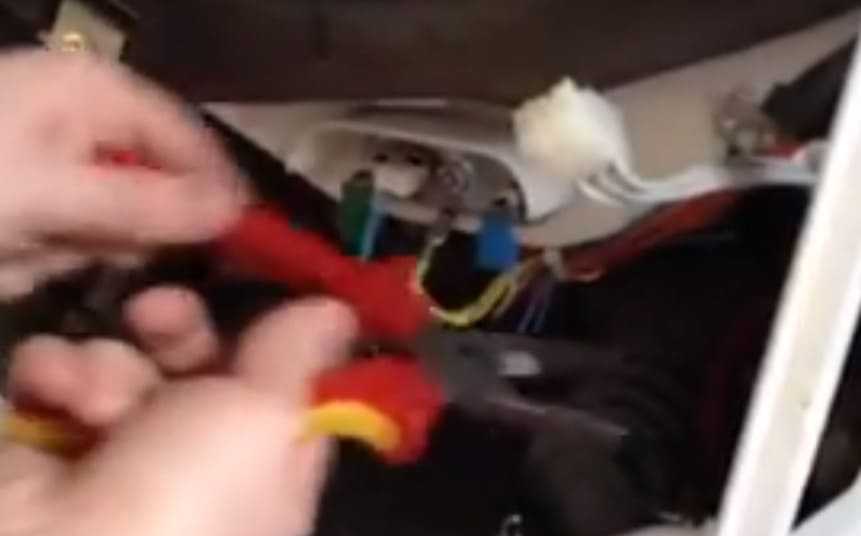 - элемент сдергивается с пластмассовых фиксаторов, но действия ваши должны быть осторожными, чтобы не повредить проводку датчика, контролирующего возможные протечки;