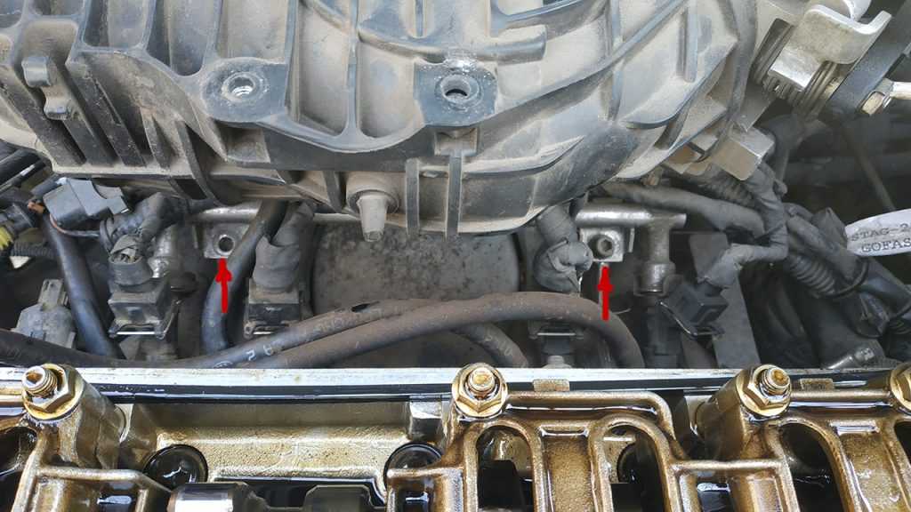 Сама рампы с форсунками крепится к двигателю двумя болтами под шестигранник. Выкручиваем их и рампу можно свободно вытаскивать.