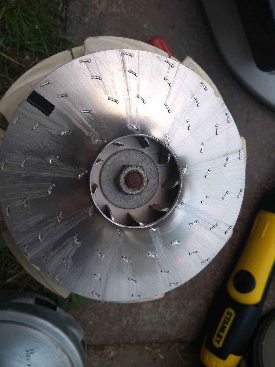 Крыльчатка крепиться к валу при помощи гайки с левой резьбой, соответственно откручивать необходимо по часовой стрелке. Если гайка не прикипела к валу, то открутить её можно шуруповертом.