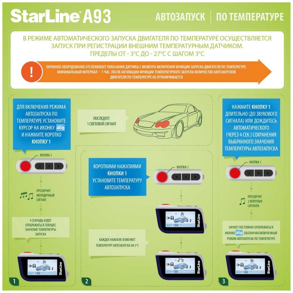 Сигнализация Starline A93 позволяет осуществить автозапуск по температуре двигателя в случае, если она упадёт ниже запрограммированной. Диапазон запуска назначается от -3°С до -27°С с шагом 3.