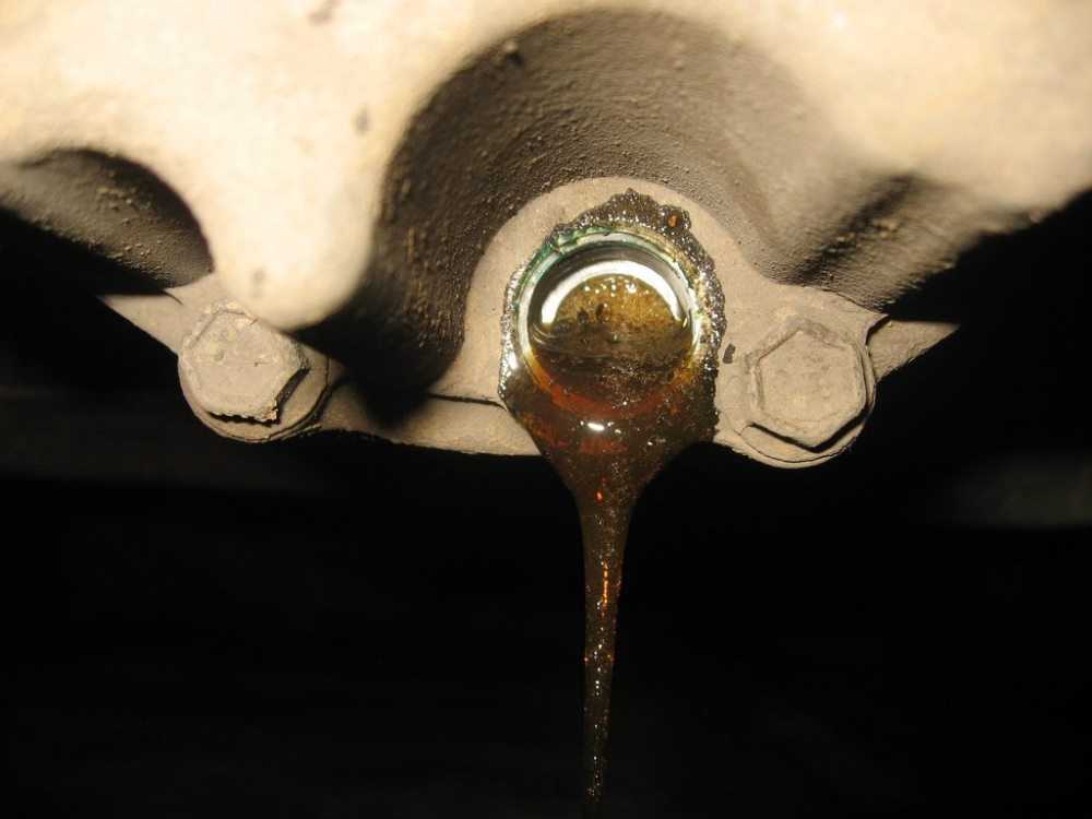 - Отворачиваем болт на сливном отверстии и даём вытечь всей отработанной жидкости.