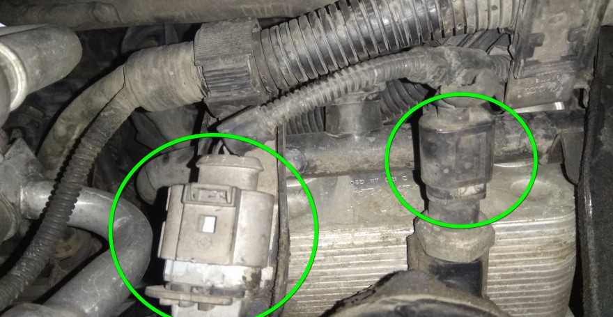 Чтобы добраться до колец масляного стакана, следует демонтировать впускной коллектор. Начинать работу следует со снятия клемм АКБ. С нижней части авто необходимо отсоединить 2 фишки проводов (см. фото) и болты коллектора.