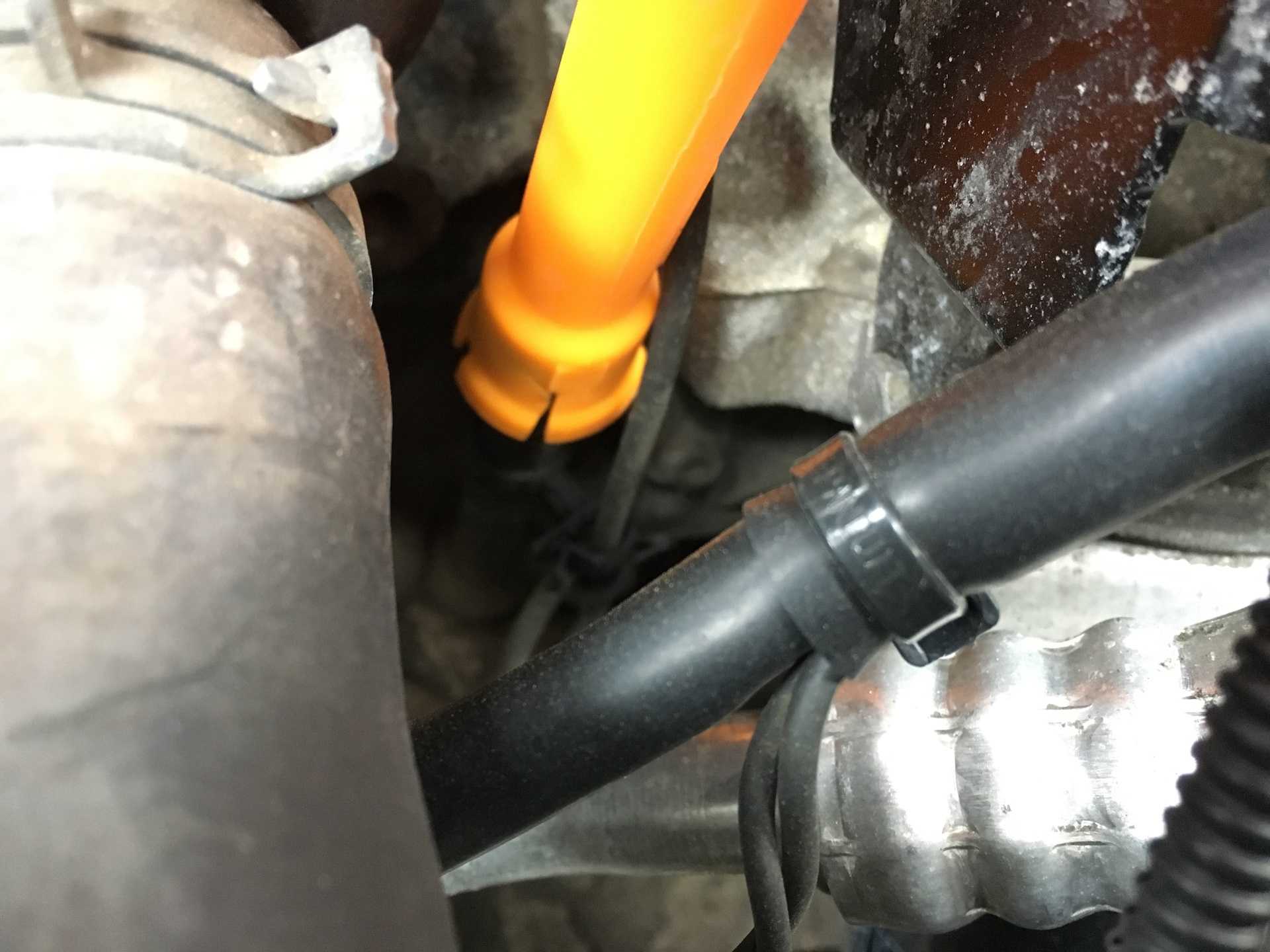При помощи ключа T30 откручивается первое крепление патрубка охлаждения к ДВС. Второе расположено со стороны коробки (закреплено гайкой на 10 мм). Далее под двигатель устанавливается емкость для антифриза. Сняв еврохомут плоскогубцами, можно оттянуть шланг от маслоохладителя. Чтобы жидкость слилась полностью, откручивается пробка расширительного бачка.
