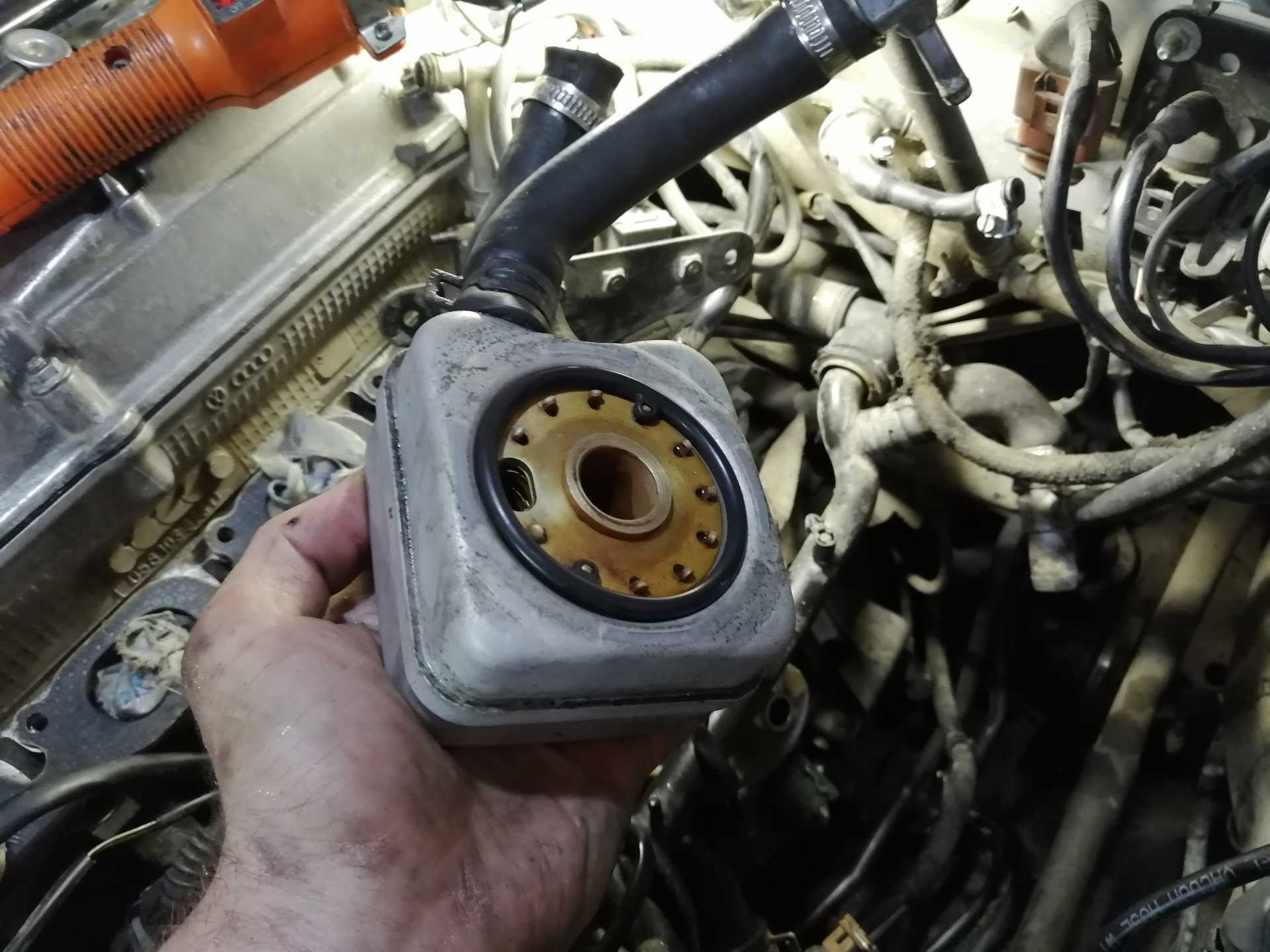 Направляющая монтируется на место. Устанавливается коллектор, все ранее отключенные разъемы, трубки и т.д. Масляный фильтр можно использовать прежний. На этом замена теплообменника Passat b6 завершена.