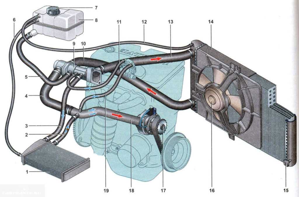 1 — Радиатор печки; 2,3,4,5,6,10,11,12,13,19 — Патрубки системы охлаждения; 7 — Крышка расширителя; 8 — Расширитель; 9 — Термостат; 14 — Радиатор охлаждения; 15 — Пробка слива ОЖ; 16 — Вентилятор; 17 — Помпа; 18 — Трубка подводящая;