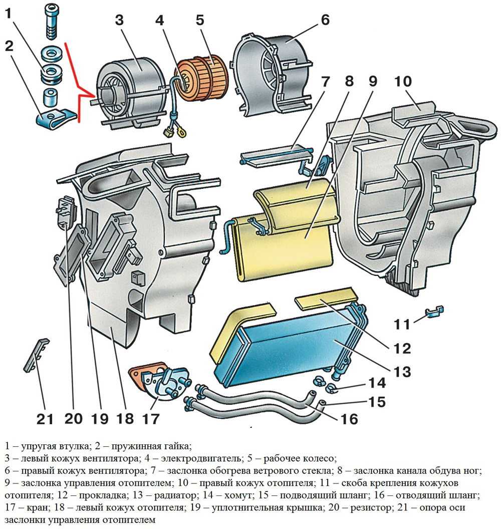 Положительным моментом устройства отопителя на ВАЗ — 2101 является его расположение – чтобы добраться к нему и к заслонкам можно из подкапотного пространства и переднюю панель снимать не придется.