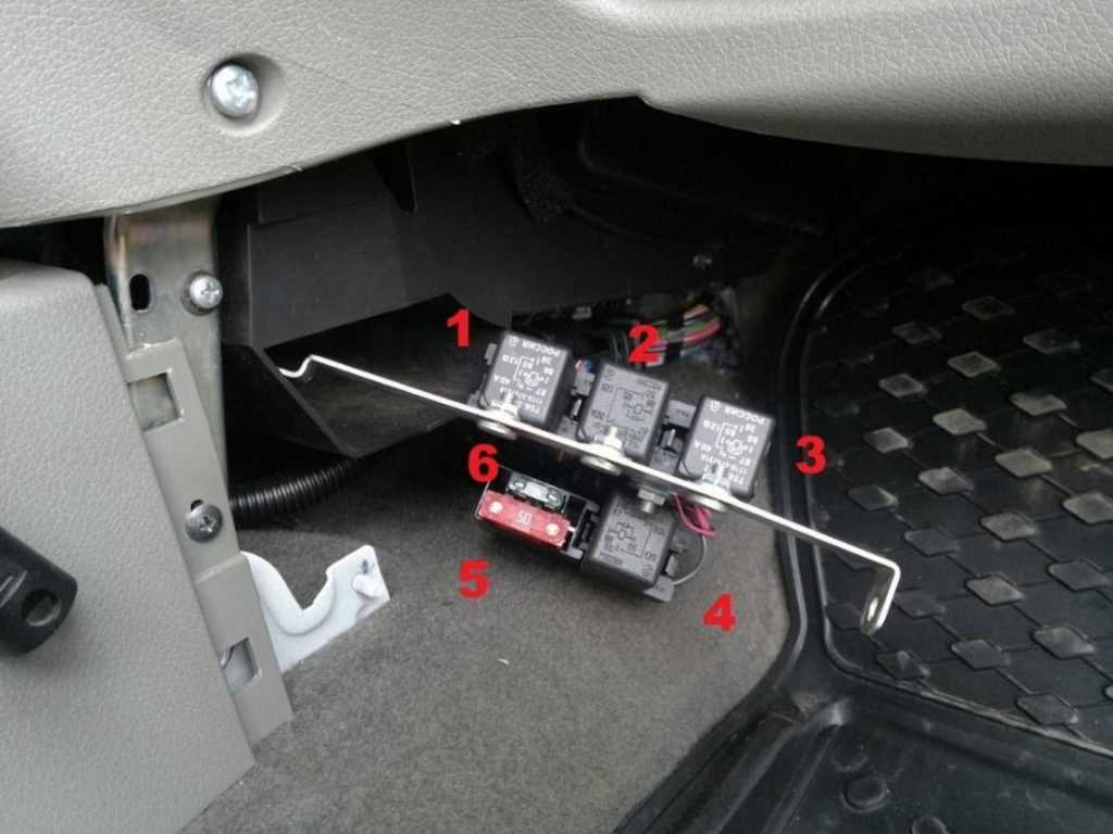 - Установите блок реле под центральную консоль и закрепите гайкой.