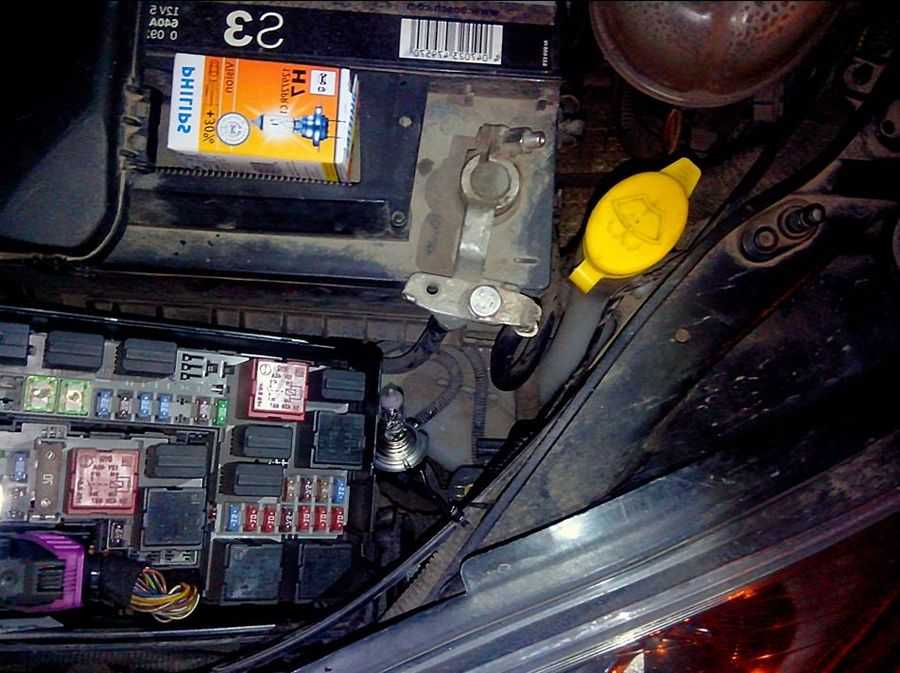 Что касается левой стороны, то тут все несколько сложнее – вначале необходимо снять крышку с блока предохранителей, чтобы освободить хоть немного пространства, после этого нужно отщелкнуть защелку задней крышки на корпусе фары и отодвинуть ее.