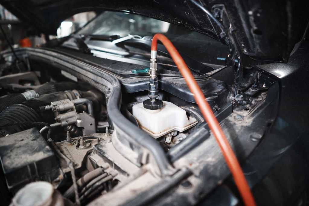 Откачиваем жидкость из бачка, подсоединяем установку с заранее залитой DOT4 – общепринятым мировым стандартом.