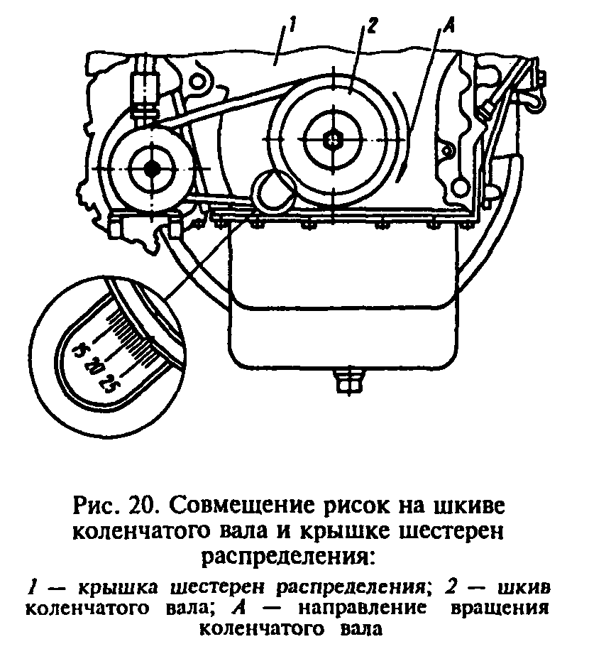 Для проверки и регулировки угла опережения впрыска необходимо совместить метки на шкиве коленчатого вала и крышке шестерен распределения или на маховике с указателем, соответствующим установочному углу опережения впрыска, вращая коленчатый вал по часовой стрелке. Риска на шкиве коленчатого вала должна находиться против риски, соответствующей установочному углу 20° (рис.20).