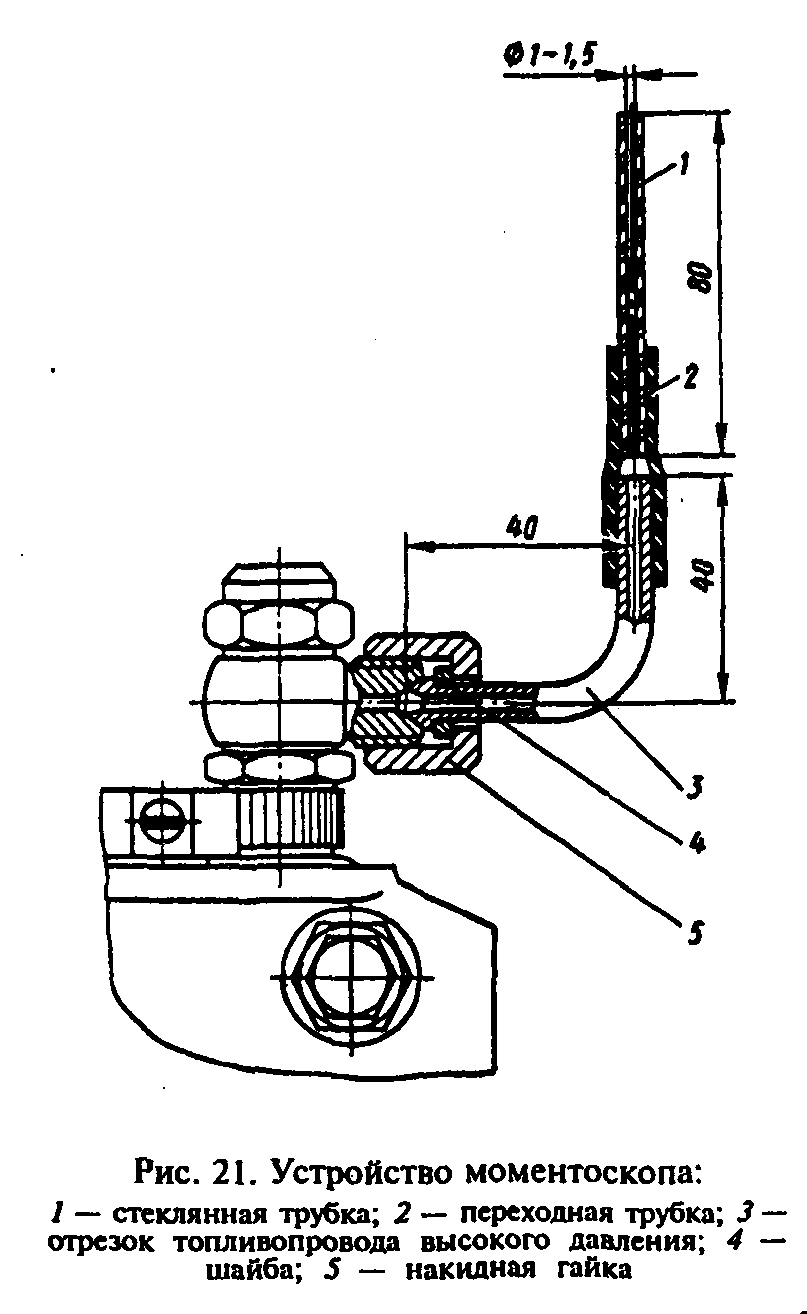 Если на топливном насосе отсутствует указатель установочного угла опережения впрыска, то установку угла опережения впрыска следует производить по моментоскопу (рис.21).
