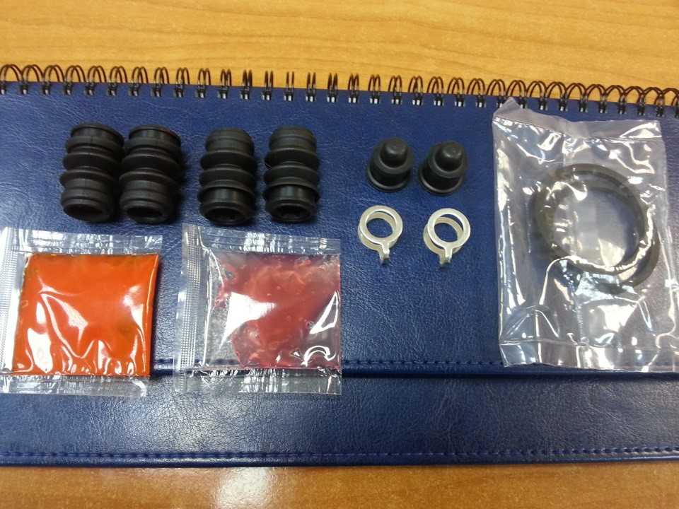 На фото ниже представлена направляющая суппорта и комплект резиновых чехлов для него, а также болт, вставляющийся в направляющую.