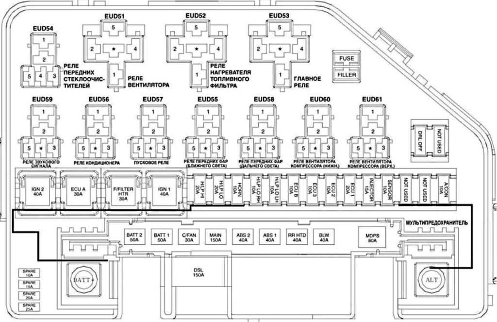 | MAIN | 150А Генератор, предохранители (ABS 2 40А, ABS 1 40А, RR НТО 40А, BLW 40А, MDPS 80А, A/CON 10А, DSL 150А) |