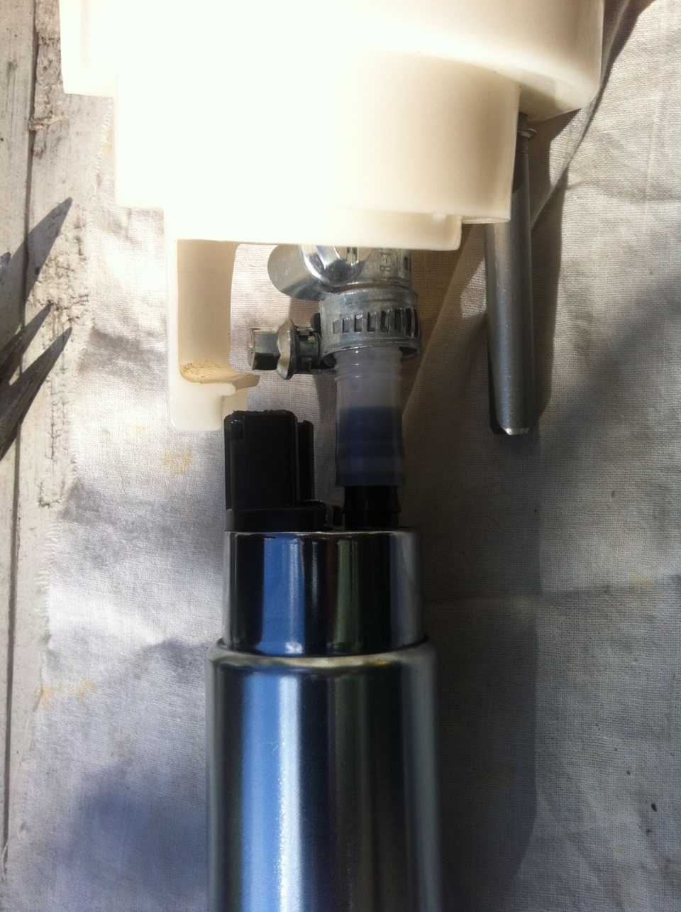 Начинаем собирать. Сначала одеваем трубку на бензонасос. Даже хорошо ее прогрев, не смогли вдвоем с папой натянуть ее до конца. Впрочем, снять ее тоже было тяжело. Натянули на сколько хватило сил и для надежности одели хомут.