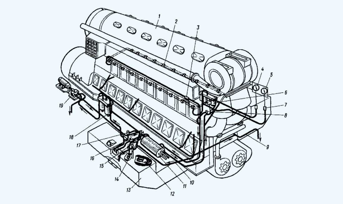 Во время запуска дизеля топливо подаётся из бака с помощью топливоподкачивающего агрегата, проходит через фильтр грубой очистки, фильтр тонкой очистки, через топливный коллектор к насосам высокого давления. Нужное давление поддерживается с помощью предохранительного клапана. Затем включается в работу топливный насос низкого давления, который направляет топливо в дизельный коллектор. Излишки топлива стекают из форсунок в бак. Манометры контролируют степень загрязненности фильтров, если перепад давления более 0,3 МПа, то фильтрующие элементы подлежат замене.