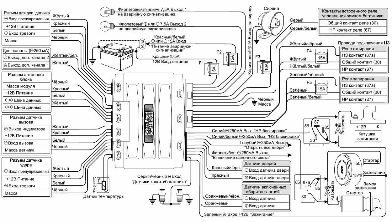Установщик должен подключать оборудование при помощи штатных жгутов. Для подсоединения к центральному блоку используются пластиковые разъемы, оборудованные резиновым уплотнителем и защелкой. Схема подключения 18-контактного штекера предусматривает подсоединение к бортовой сети, сирене и выходам дополнительных каналов. Отдельно подключается блок автоматического запуска и модуль управления центральным замком. В документации приведена монтажная электрическая схема, поясняющая коммутацию компонентов и предохранителей.